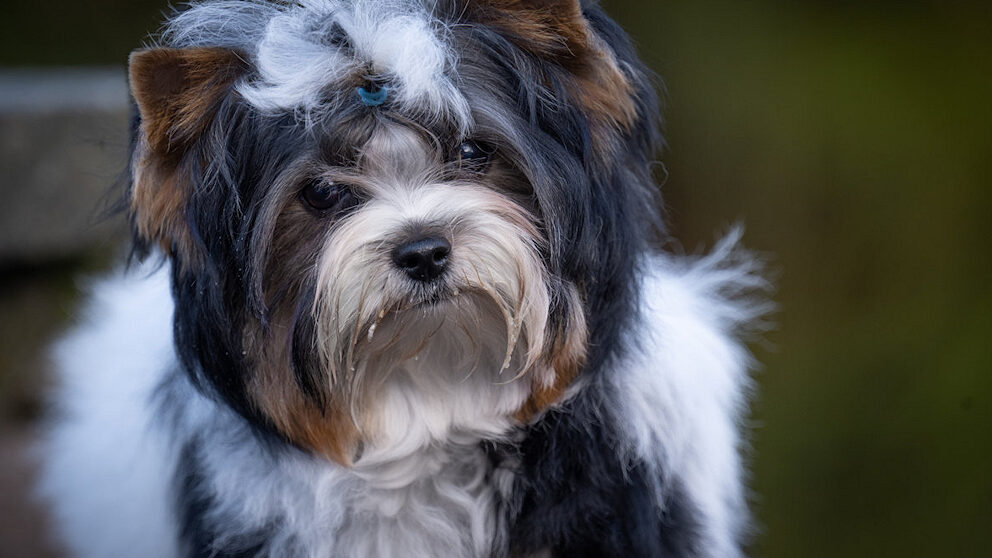She enjoys constant closeness and showers us with immense affection. Her coat has matured into a beautiful blend of blue, gold, and white. With her perfect baby doll face, ideally proportioned muzzle, and bright, dark hazel eyes, she exemplifies the Biewer Yorkshire Terrier breed splendidly.