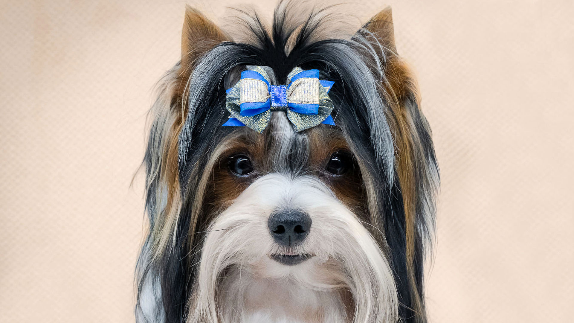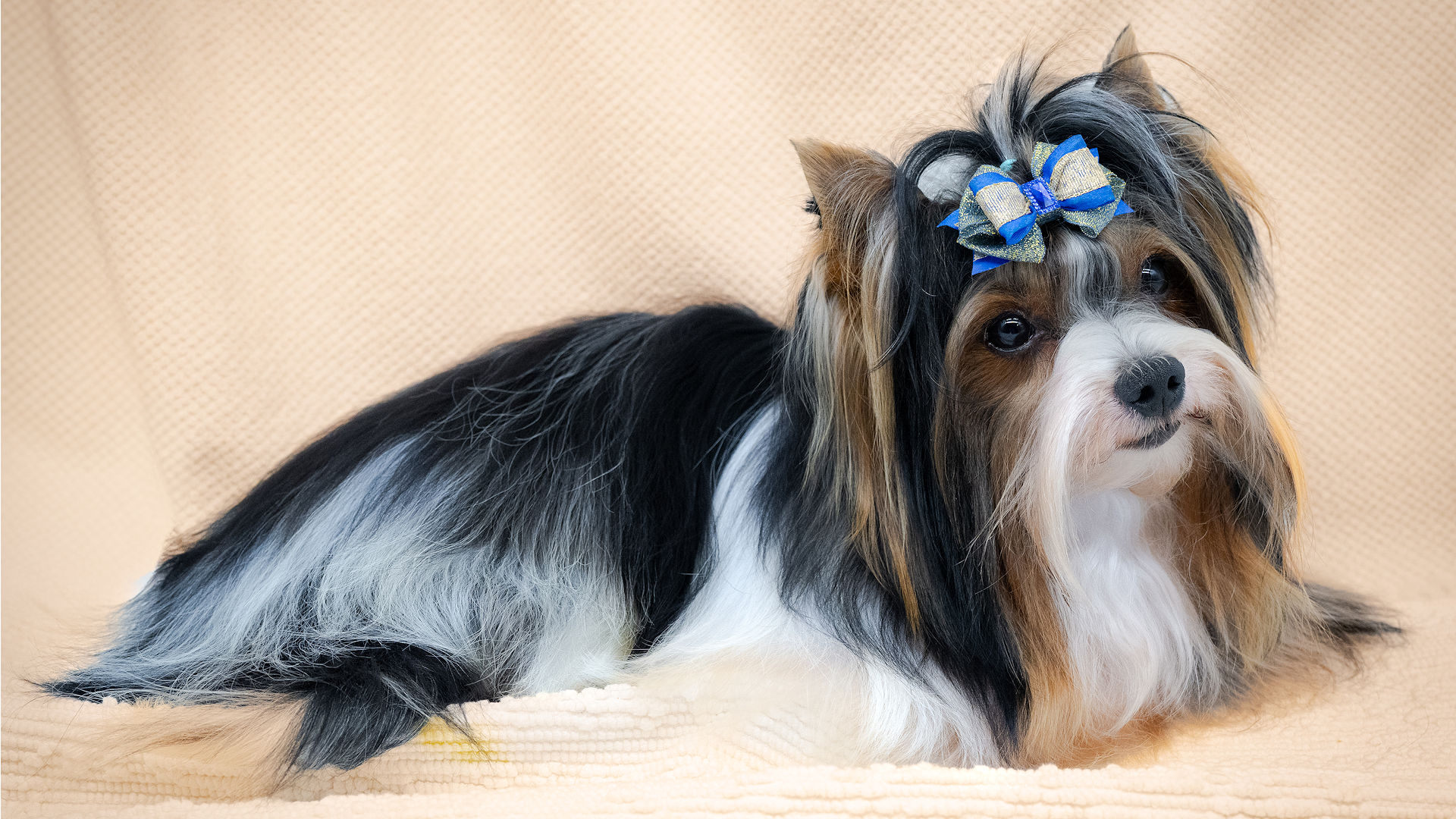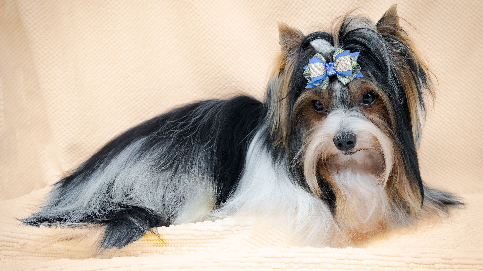 Our exquisitely handsome “Dante” is a prime example of the Biewer Terrier breed. He is without exaggeration, the sort of Biewer Terrier who makes people stop mid‑sentence and say, “Oh… he’s gorgeous.” He sports the classic tri‑colour coat of black, tan, and white with the kind of effortless glamour usually reserved for shampoo commercials. His coat flows, his markings are beautifully defined, and his large, dark, almost‑black eyes could charm the biscuits out of anyone’s pocket. Add in his neat, upright pricked ears, and you have a dog who looks permanently ready for his close‑up.